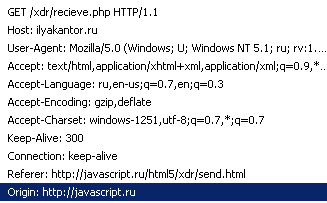Кросс-доменный запрос отсылается точно так же, как и обычный XMLHttpRequest, но браузер посылает на сервер дополнительный заголовок Origin.